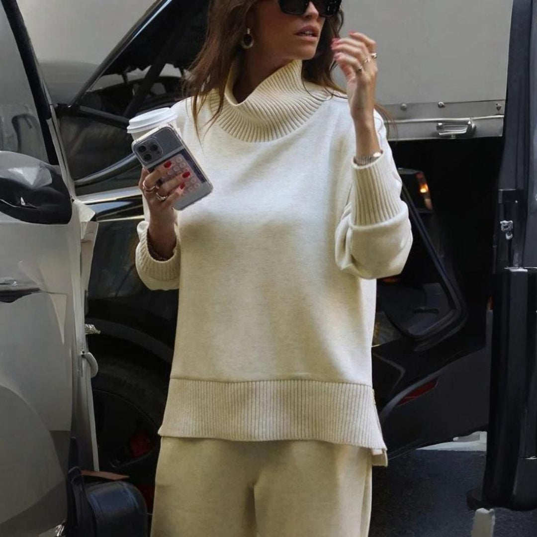 A camisola de gola alta com fecho lateral adiciona um toque de elegância funcional, enquanto as calças largas com cintura elástica garantem liberdade de movimento e conforto absoluto.
